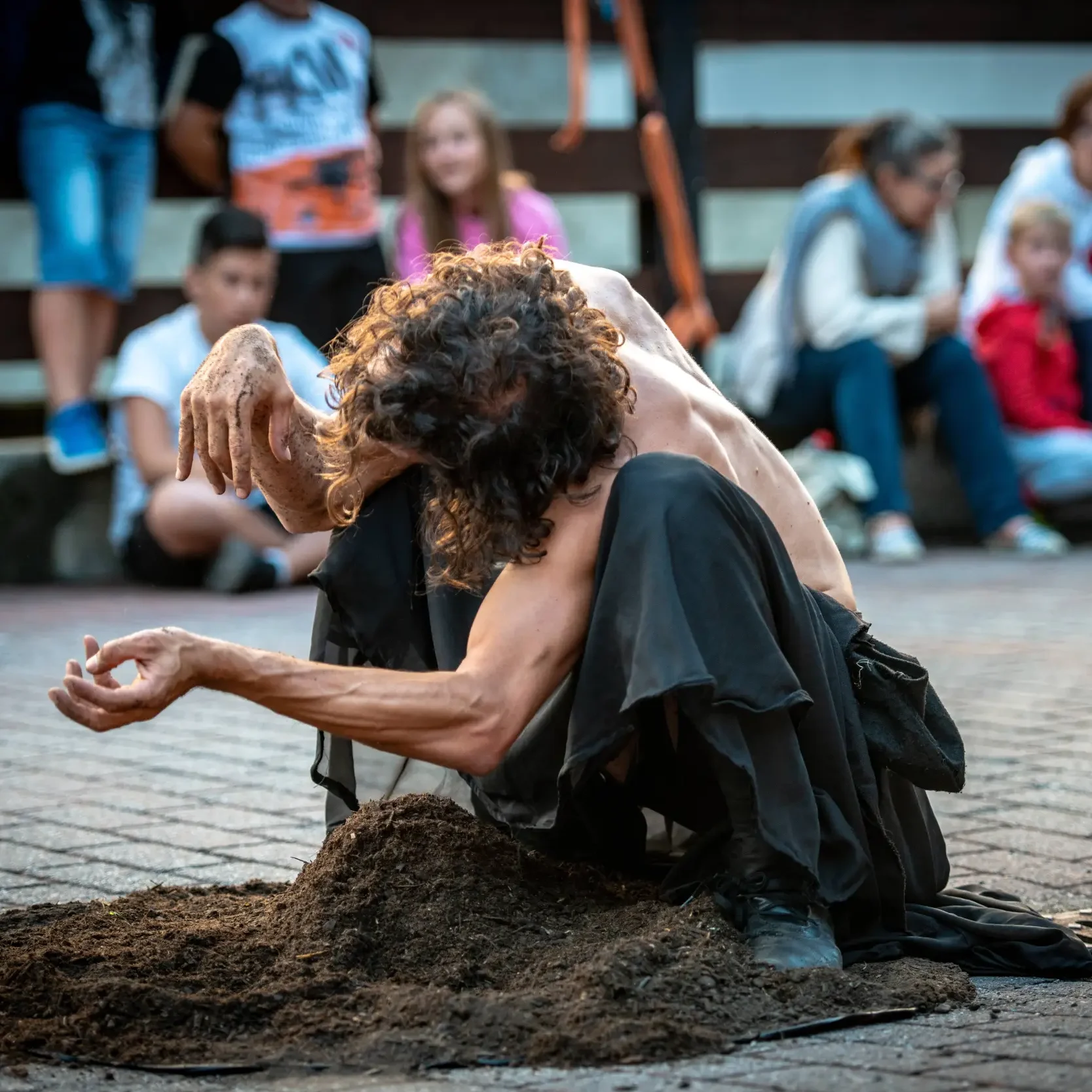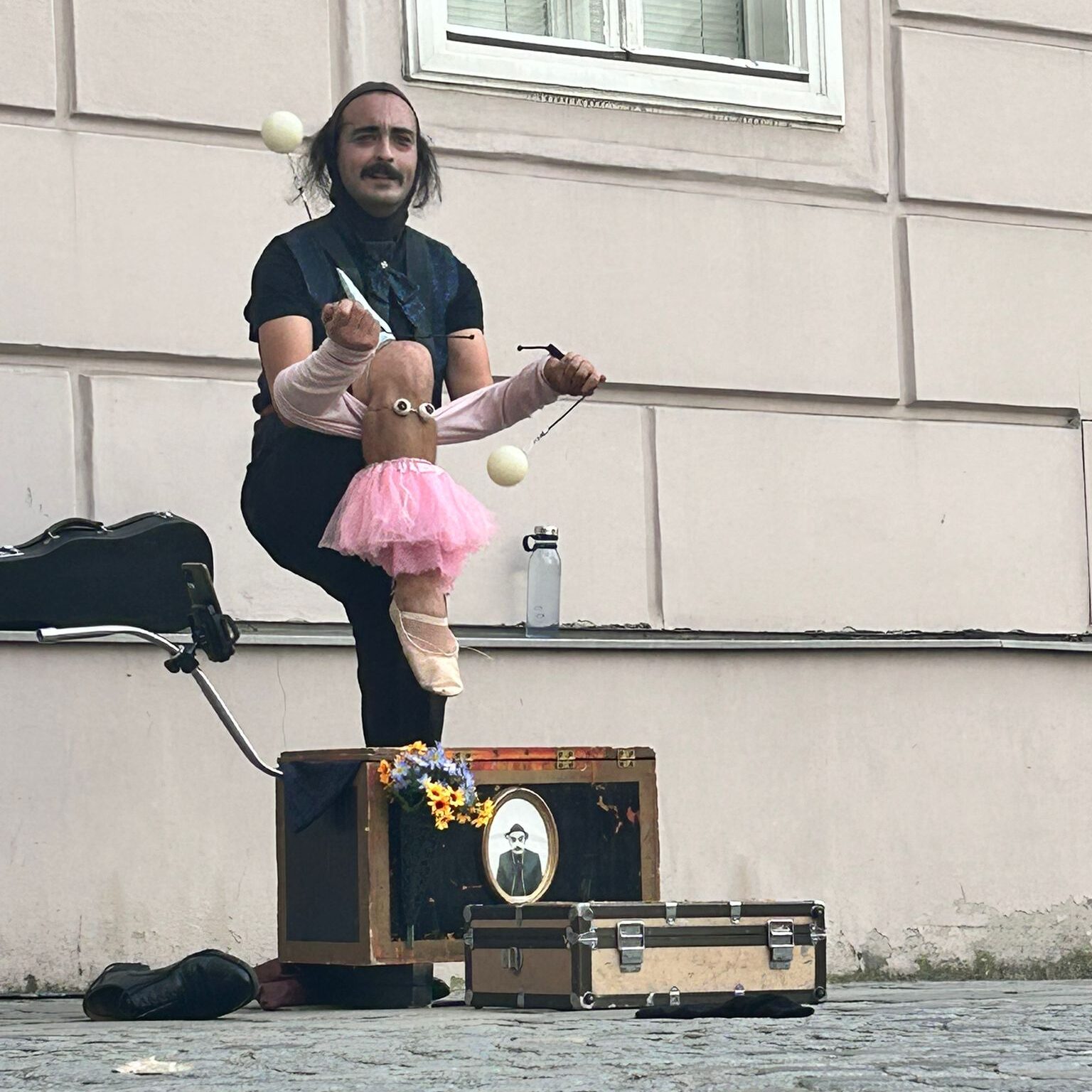 In questo spettacolo muto, uno strano ed eccentrico personaggio fa piccoli scherzi al pubblico, cercando la sua complicità ed attenzione per creare un momento di condivisione e spensieratezza.